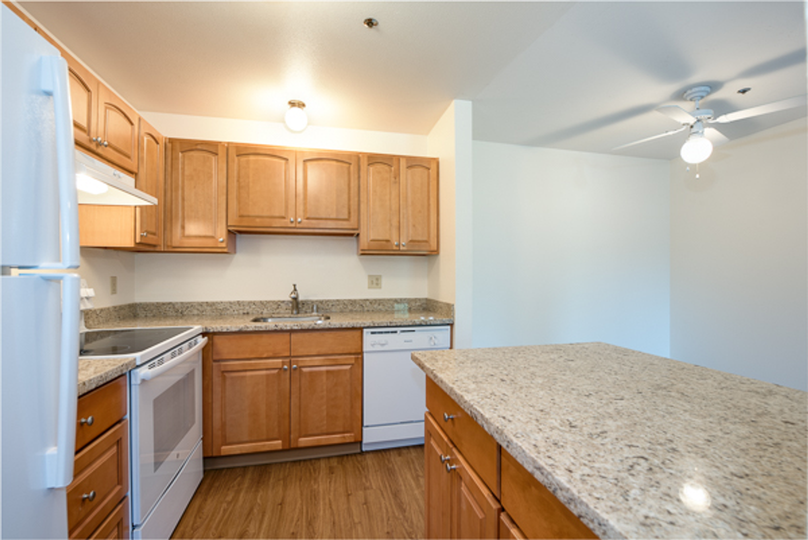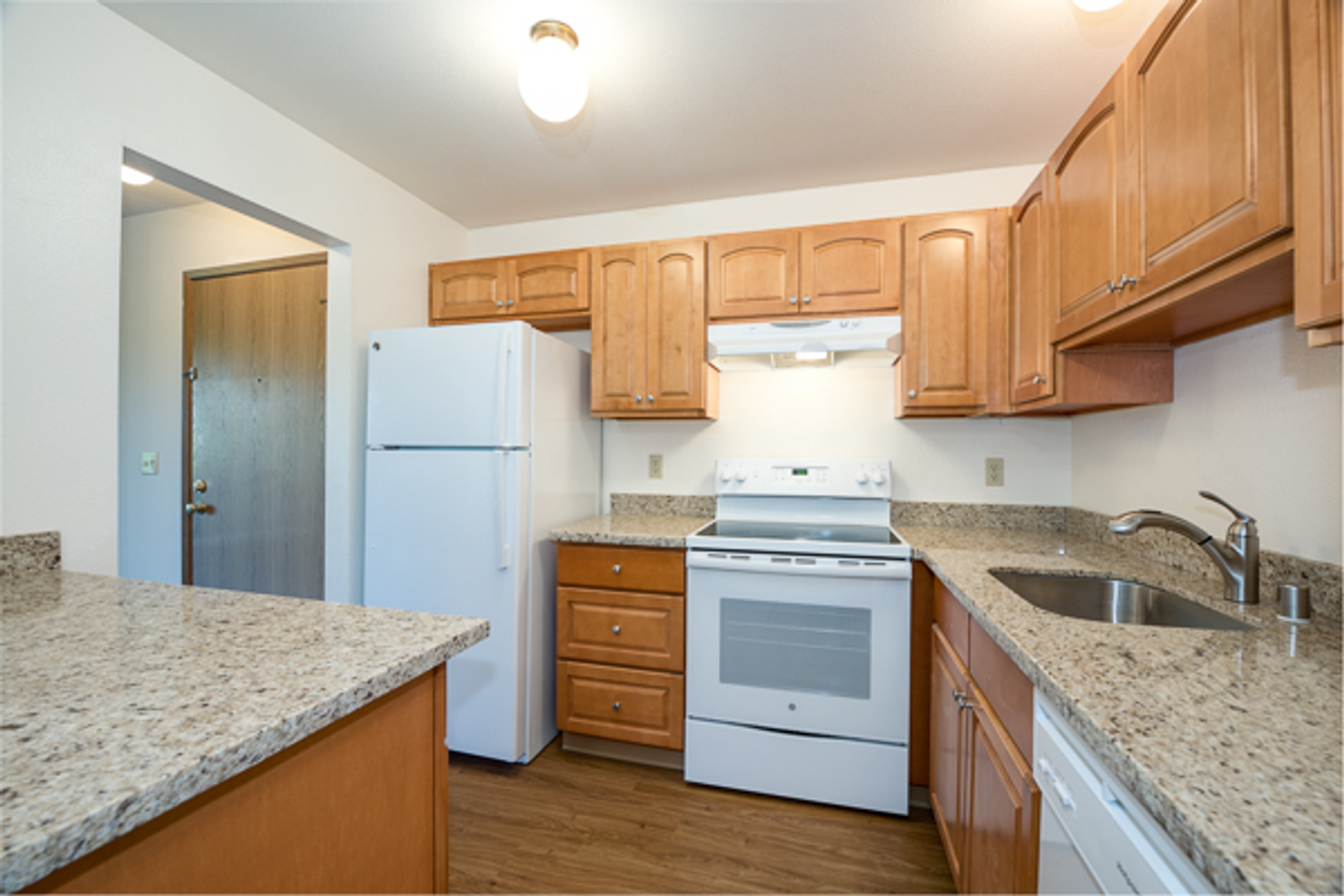 • Modern kitchen appliances, including dishwasher, refrigerator, and garbage disposal